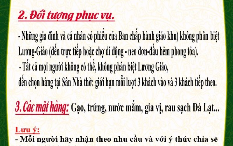 Trên tinh thần chia sẻ và giúp đỡ nhau trong hoàn cảnh dịch bệnh đang hoành hành... Cha sở cùng Ban Caritas tổ chức "PHIÊN CHỢ GIÁ O ĐỒNG" phục vụ miễn phí hok phân biệt Lương Giáo để cung cấp lương thực cho bà con giáo dân. Mọi người nhớ liên hệ với Trưởng Khu để nắm thông tin và nhận "Phiếu" đi chợ nhé (nhớ đem theo túi đựng và nhận theo nhu cầu để sẻ chia cho người còn lại). Mọi người đọc kỹ thông báo phía dưới và thực hiện tốt quy tắc phòng dịch 5K nha.